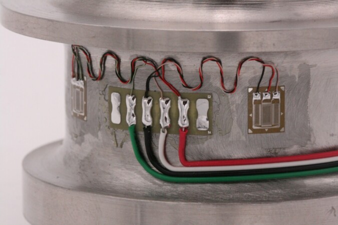 Image 4: CLT load cell assembly with Micro Measurements strain gages, terminal strips and wire.